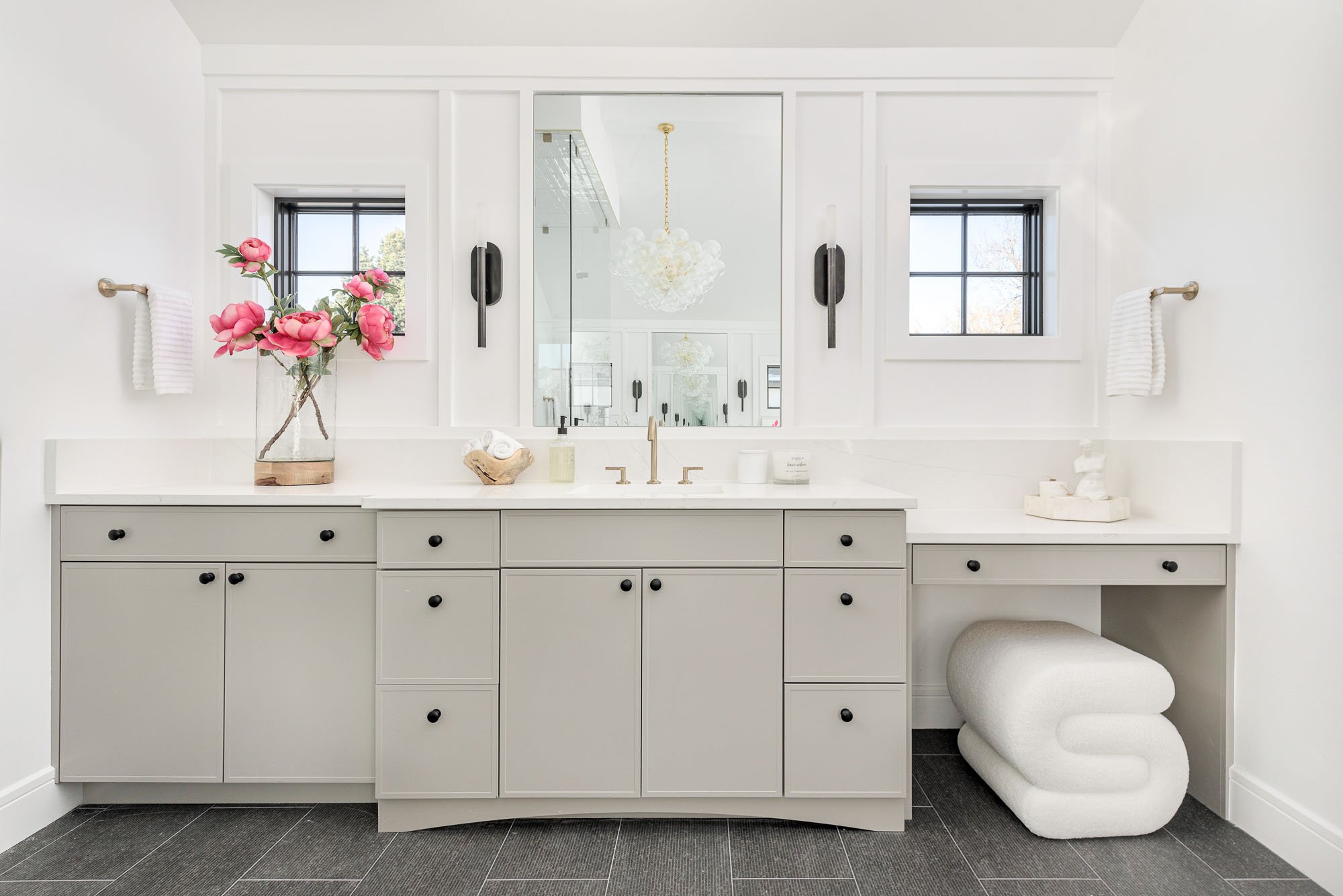 High-end appliances, custom cabinetry, and a luxurious waterfall countertop come together to form a culinary oasis. A haven for culinary enthusiasts and entertainers alike, the kitchen seamlessly integrates with the adjacent dining nook and great room, allowing for both intimate family meals and lavish entertaining.